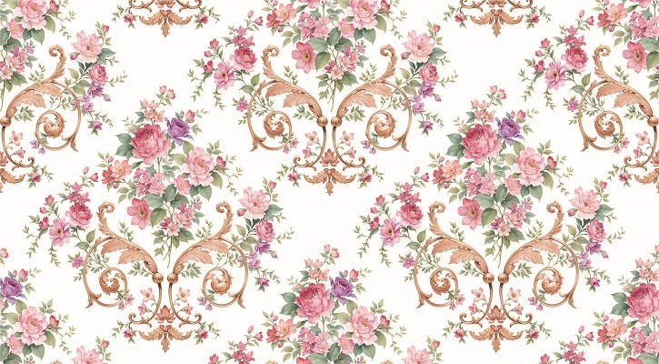 A sweet-themed print on a dull pink background, sprinkled with girls' favorite motifs of cakes, fruit, and ribbons.